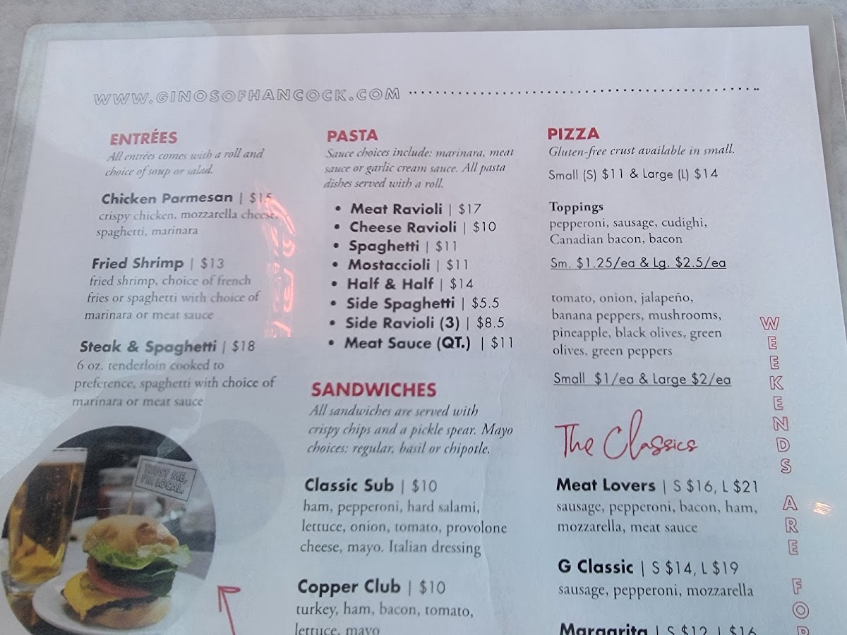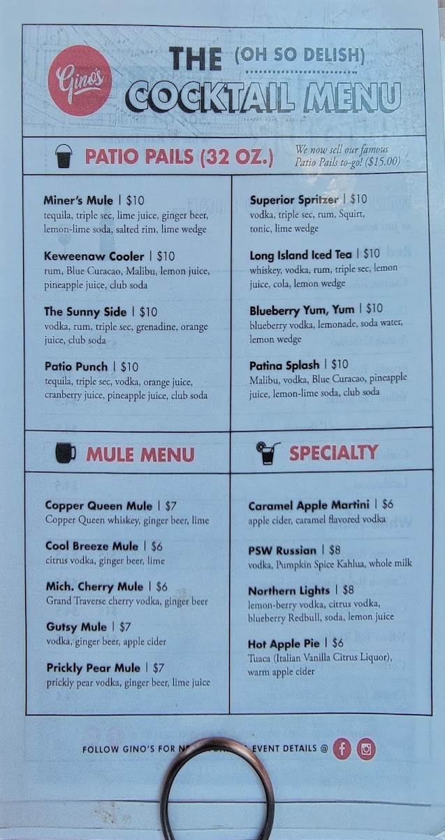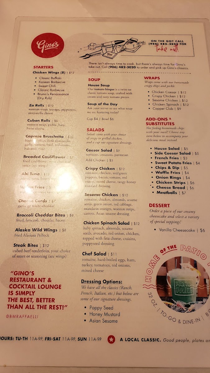 If you’re looking to indulge your taste buds in a relaxed and friendly setting, Gino’s Restaurant & Cocktail Lounge is the place to be. So whether you’re drawn in by the promise of hearty food, crafted cocktails, or delightful desserts, prepare for a memorable dining experience in Hancock, Michigan.