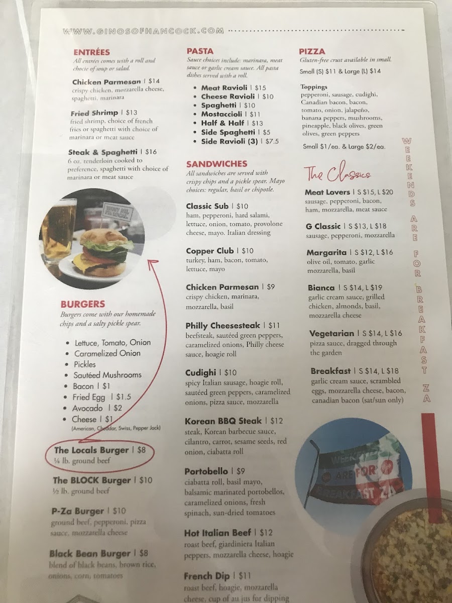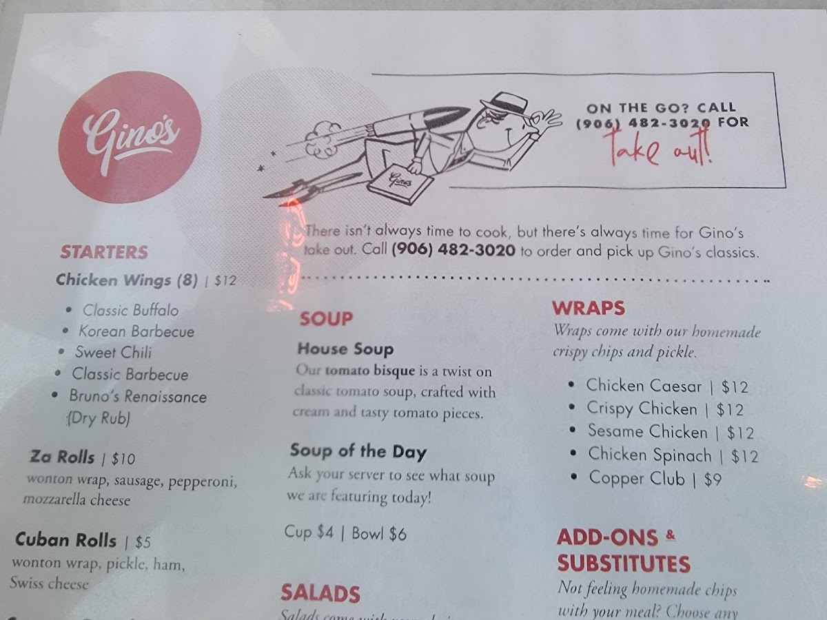 Our consistent go to for comfort food and good drinks! We love Gino’s, they’ve never missed the mark for us. Good apps within a variety of price ranges, same goes for entrees and drinks. They also have NA mocktails as well. The veggie burger they serve is probably my favorite thing there and I love normal burgers. For a black bean base it’s still really flavorful and yummy. Patio pails are great, but my favorite is the stormy superior. If you’re traveling through, you’ll notice that the pizza is not what you expect and that’s pretty common for the area. If you want what’s considered normal pizza then dominos is your best bet. But don’t write off the pizzas up here until you’ve tried them, they don’t always scratch the itch I get for pizza- but they’re good. Overall, decent, good, and reliable food and drink. Service has never missed either even when they’re insanely busy.