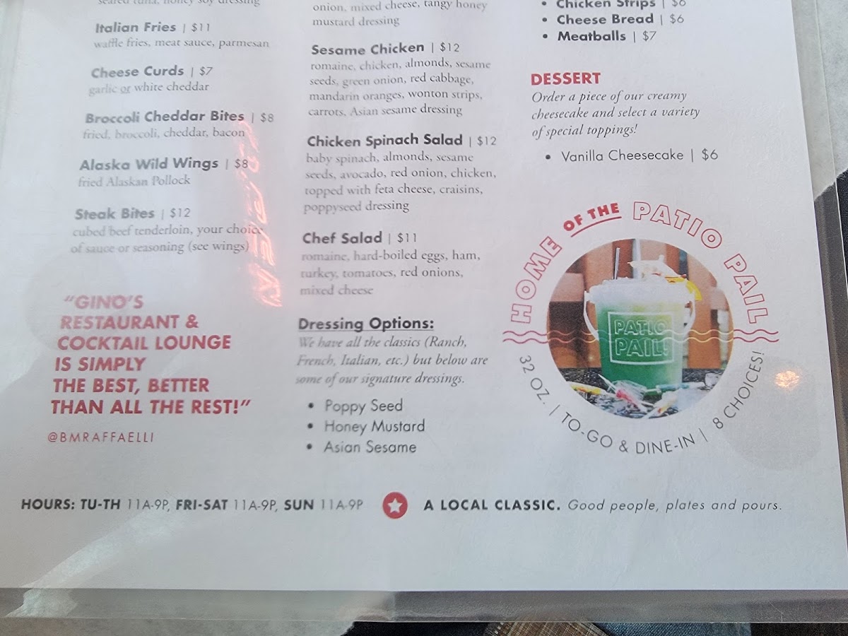 Not to be overlooked, the restaurant includes a variety of add-ons such as house salads, French fries, and even sweet potato fries to complement your meal. The Turtle Cheesecake is mentioned by Kyle Dorsty as a decadent dessert that shouldn’t be missed, highlighting Gino’s ability to provide satisfying meals from appetizer to dessert.